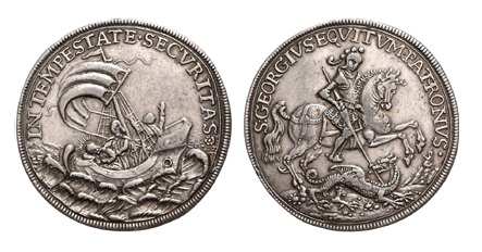 Il motto era su una medaglietta che mi aveva dato la nonna, non so dove sia finita ma era molto simile a questa: da una parte una nave nella tempesta e dall’altra un cavaliere che combatte con un drago.