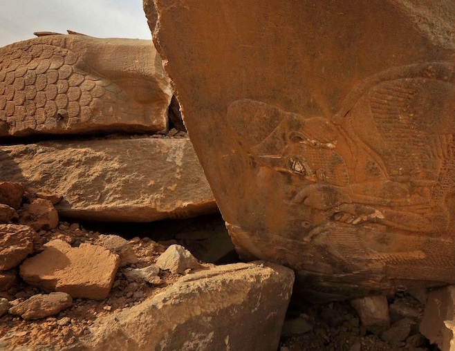 Frammenti di bassorilievi distrutti a Nimrud, fotografati dopo che il sito archeologico è stato riconquistato dall’esercito iracheno, novembre 2016 (SAFIN HAMED/AFP/Getty Images)