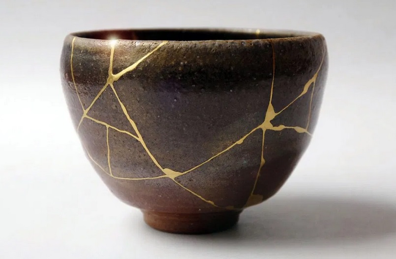 Kintsukuroi o kintsugi: arte giapponese della riparazione di oggetti fratturati, impiegando materiali pregiati come oro o argento per saldare i frammenti.